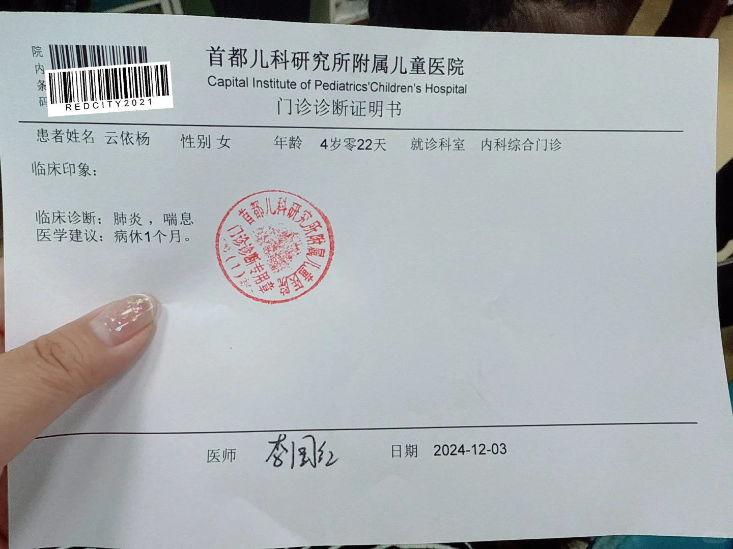 💡20号从三亚回来第二、三天就有点咳嗽流鼻涕,还以为是太热突然到太冷的地方没适应着凉了呢。然后想着第二天带她去儿研所后来一看公众号上也没有号,只有23号夜班特需有号就花300挂了一个,去了医生首先开单子查血查支原体,等了一会结果出来了,除了C反应蛋白高点 别的都没事,支原体也是阴性,就开了三天的阿奇和小儿退热口服液回家了。